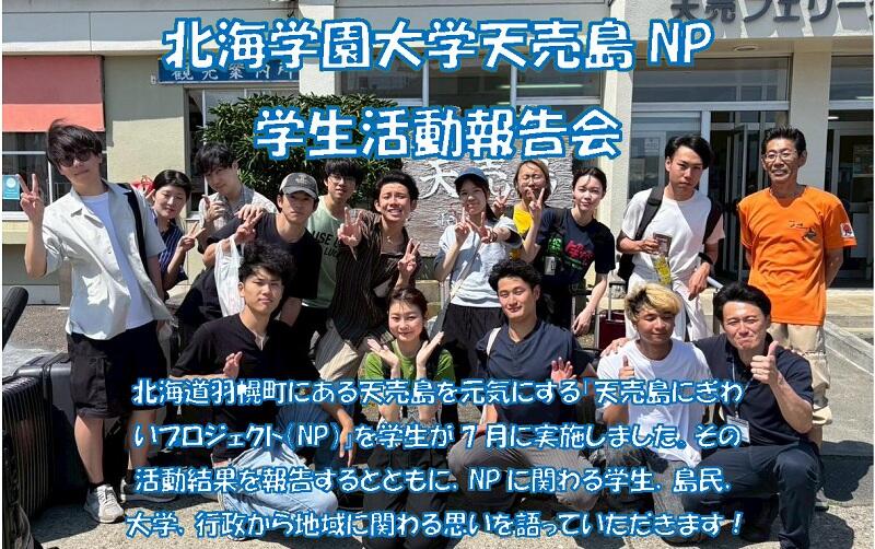 北海道羽幌町にある天売島を元気にする「天売島にぎわいプロジェクト(NP)」を学生が7月に実施しました。 その活動結果を報告するとともに、NPに関わる学生、島民、大学、行政から地域に関わ...