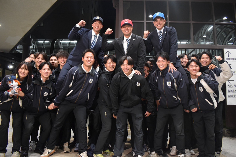 在学生・OB・OGのみなさん、本学硬式野球部ならびにプロのステージへ力強く進んでいく3名への応援をよろしくお願いします。