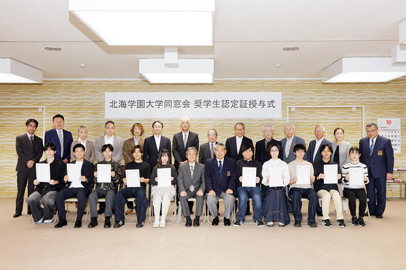 2025(令和7)年10月2日(木)、同窓会会長、同窓会役員、学長、学部長ほか関係者同席の下、北海学園大学同窓会奨学生認定授与式を行いました。 今年度選考された18名の奨学生に対して、...