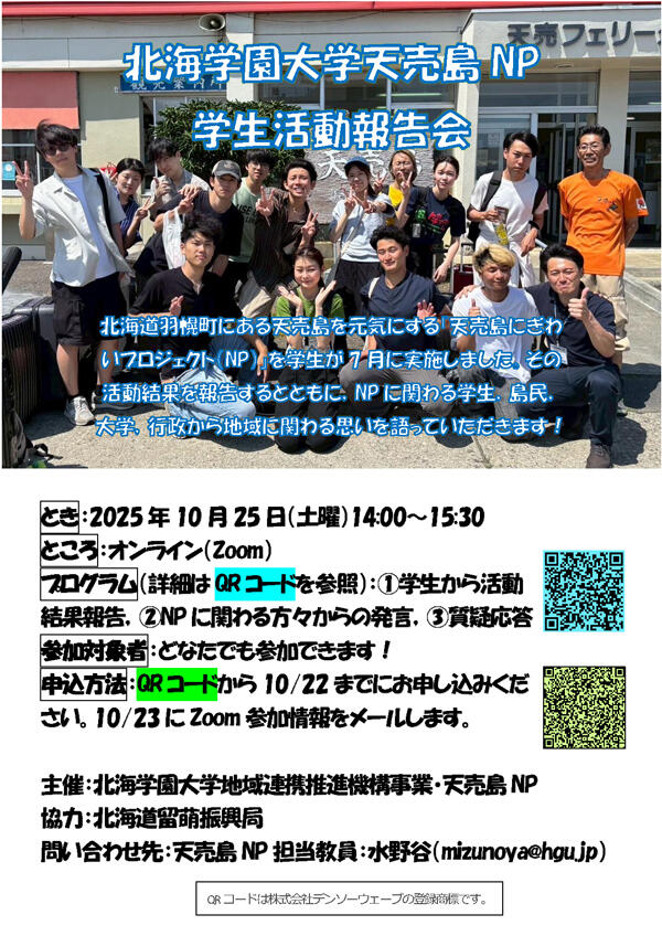 お知らせ最終更新日:2025.10.10天売島にぎわいプロジェクト(NP)学生活動報告会 北海道羽幌町にある天売島を元気にする「天売島にぎわいプロジェクト(NP)」を学生が7月に実施しました。 その活動結果を報告するとともに、NPに関わる学生、島民、大学、行政から地域に関わる思いを語っていただきます。 詳細はポスターをご覧ください。 ニュース・お知らせの一覧へ