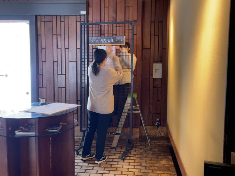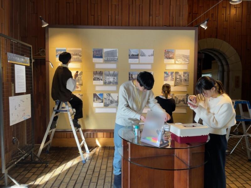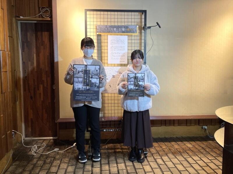 私たちは展示のタイトルやレイアウト、ポスター作成などを担当しました。展示のタイトルである「モノクロ写真に記憶で彩りを」は、写真が白黒だった時代を生きていた方たちの記憶に残っている小樽の情景には、彩りがあると思ったところから考えました。