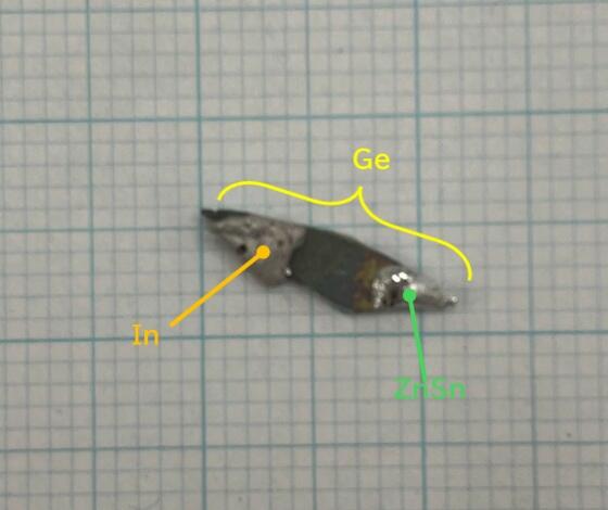 約60分間にわたる実習体験は事前講義からスタートしました。ダイオードと抵抗器の違いやダイオードの内部構造に加え、安全に配慮した半導体製造のレガシー技術である「拡散法」について簡単な解説が行われました。続いて行われたダイオードの作製工程では、ゲルマニウム(Ge)ウエハにドーパント(不純物)の拡散源となるインジウム(In)をはんだ付けする作業に学長ご自身が挑戦されました(図1)。その後、アルゴン(Ar)ガス雰囲気下で550℃・20分間の加熱および冷却を行い(図2)、さらに亜鉛スズ(ZnSn)合金電極を超音波はんだ付けにて接合し(図3)、デバイスを完成させました(図4)。実習の最後には、完成したダイオードの実験評価を行いました。カーブトレーサーを用いて電流電圧特性を測定した結果、学長が作製されたデバイスは見事に「整流特性」を示しました。グラフ(図5)が示す通り、電圧が負の領域では電流があまり流れず(スイッチオフ=「0」)、正の領域では電流が良く流れる(スイッチオン=「1」)という結果が得られ、デジタルの「0」と「1」を作り出す半導体の基礎原理をしっかりとご確認いただくことができました。