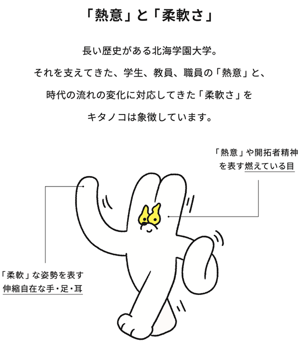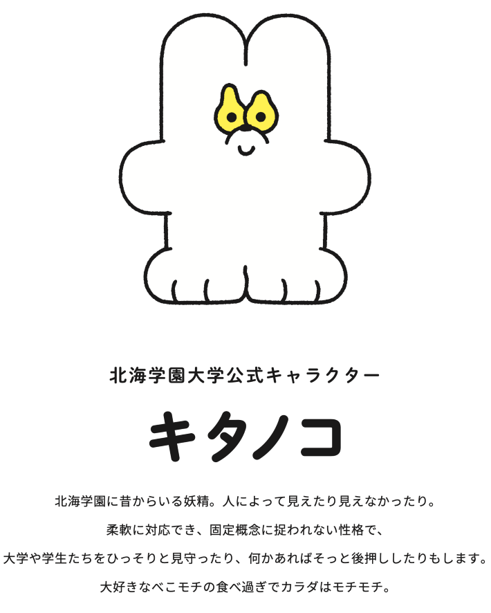 制作段階から多くの学生・教職員がかかわりながら生まれたキタノコには、各々がイメージする「北海学園大学らしさ」が息づいています。また、本学を体現するキタノコも、挑戦を続ける学生たちや大学を見守る静かな応援者として、共に成長していくことを願っています。